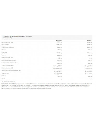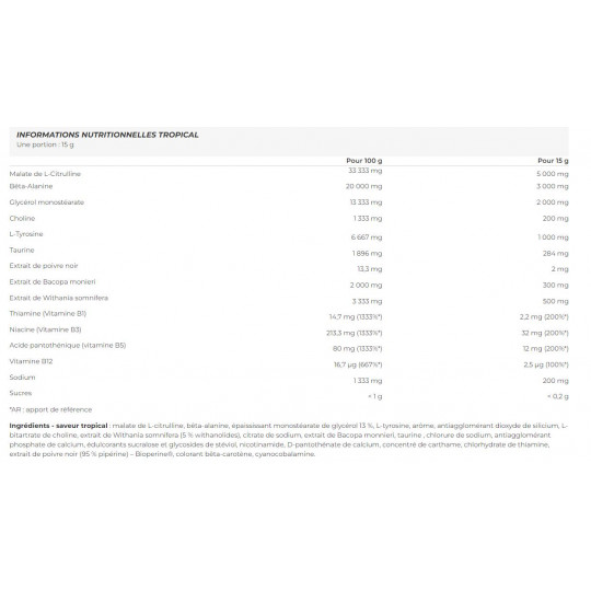 Ingrédients - saveur tropical : malate de L-citrulline, bêta-alanine, épaississant monostéarate de glycérol 13 %, L-tyrosine, arôme, antiagglomérant dioxyde de silicium, L-bitartrate de choline, extrait de Withania somnifera (5 % withanolides), citrate de sodium, extrait de Bacopa monnieri, taurine , chlorure de sodium, antiagglomérant phosphate de calcium, édulcorants sucralose et glycosides de stéviol, nicotinamide, D-pantothénate de calcium, concentré de carthame, chlorhydrate de thiamine, extrait de poivre noir (95 % pipérine) – Bioperine®, colorant bêta-carotène, cyanocobalamine.
