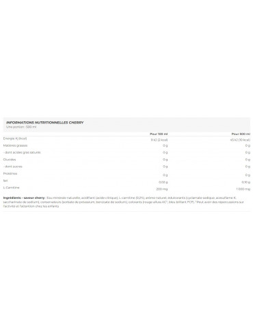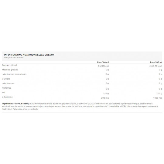 Ingrédients - saveur cherry : Eau minérale naturelle, acidifiant (acide citrique), L-carnitine (0,2%), arôme naturel, édulcorants (cyclamate sodique, acesulfame K, saccharinate de sodium), conservateurs (sorbate de potassium, benzoate de sodium), colorants (rouge allura AC¹, bleu brillant FCF). ¹Peut avoir des répercussions sur l’activité et l’attention chez les enfants