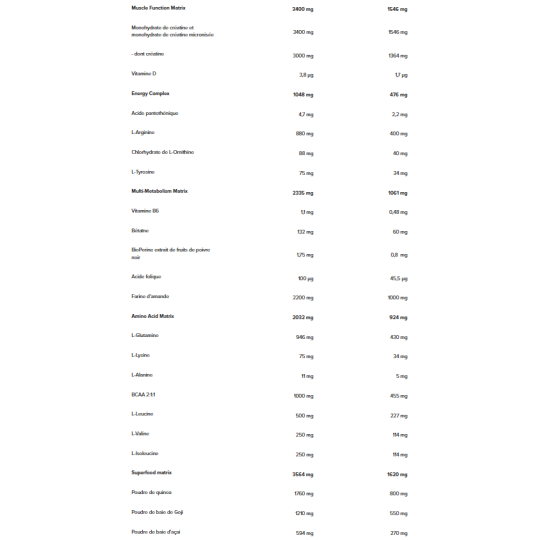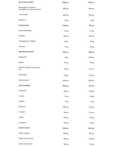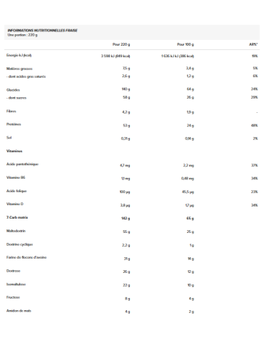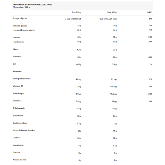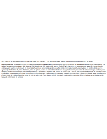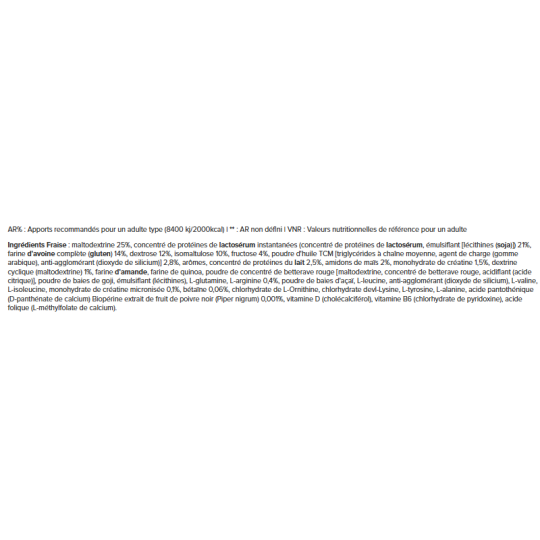 Ingrédients Fraise : maltodextrine 25%, concentré de protéines de lactosérum instantanées (concentré de protéines de lactosérum, émulsifiant [lécithines (soja)]) 21%, farine d'avoine complète (gluten) 14%, dextrose 12%, isomaltulose 10%, fructose 4%, poudre d'huile TCM [triglycérides à chaîne moyenne, agent de charge (gomme arabique), anti-agglomérant (dioxyde de silicium)] 2,8%, arômes, concentré de protéines du lait 2,5%, amidons de maïs 2%, monohydrate de créatine 1,5%, dextrine cyclique (maltodextrine) 1%, farine d'amande, farine de quinoa, poudre de concentré de betterave rouge [maltodextrine, concentré de betterave rouge, acidifiant (acide citrique)], poudre de baies de goji, émulsifiant (lécithines), L-glutamine, L-arginine 0,4%, poudre de baies d'açaï, L-leucine, anti-agglomérant (dioxyde de silicium), L-valine, L-isoleucine, monohydrate de créatine micronisée 0,1%, bétaïne 0,06%, chlorhydrate de L-Ornithine, chlorhydrate devl-Lysine, L-tyrosine, L-alanine, acide pantothénique (D-panthénate de calcium) Biopérine extrait de fruit de poivre noir (Piper nigrum) 0,001%, vitamine D (cholécalciférol), vitamine B6 (chlorhydrate de pyridoxine), acide folique (L-méthylfolate de calcium).