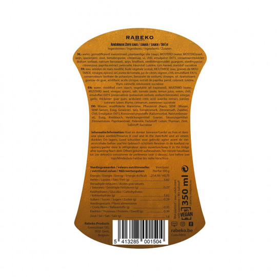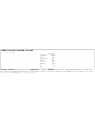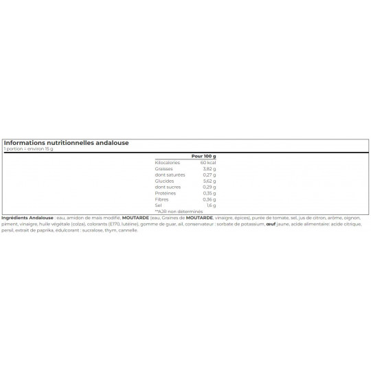 Ingrédients Andalouse : eau, amidon de maïs modifié, MOUTARDE (eau, Graines de MOUTARDE, vinaigre, épices), purée de tomate, sel, jus de citron, arôme, oignon, piment, vinaigre, huile végétale (colza), colorants (E170, lutéine), gomme de guar, ail, conservateur : sorbate de potassium, œuf jaune, acide alimentaire: acide citrique, persil, extrait de paprika, édulcorant : sucralose, thym, cannelle.