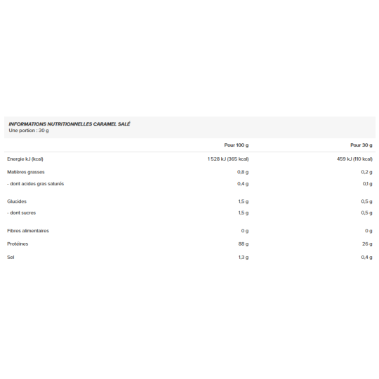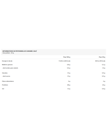 Ingrédients - saveur Caramel Salé : Protéines de lait (isolat de lactosérum, émulsifiant : lécithine de tournesol), arôme, édulcorant : sucralose, poudre de lactase.