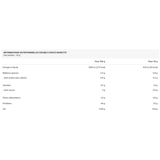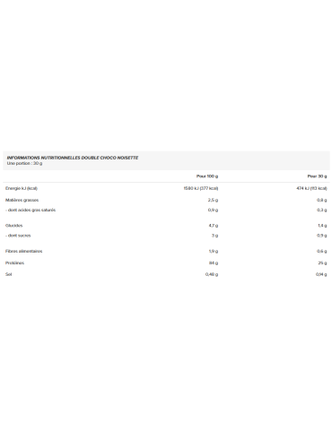 Ingrédients - saveur Double choco noisette: Protéines de lait (isolat de lactosérum, émulsifiant : lécithine de tournesol), cacao maigre en poudre (cacao maigre (Theobroma cacao L.), correcteurs d'acidité : hydroxyde de potassium, carbonates de potassium, arôme, édulcorant : sucralose, poudre de lactase.