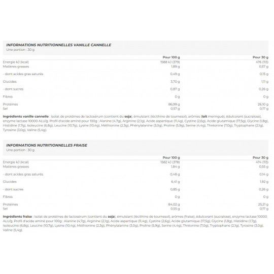 Ingrédients vanille cannelle : isolat de protéines de lactosérum (contient du soja), émulsiant (lécithine de tournesol), arômes (lait meringué), édulcorant (sucralose), enzyme lactase 10000 ALU/g. Profil d'acide aminé pour 100g : Alanine (4,7g), Arginine (2,1g), Acide aspartique (11,4g), Cystine (2,6g), Acide glutamique (17,5g), Glycine (1,8g), Histidine (1,7g), Isoleucine (6,8g), Leucine (10,7g), Lysine (10,4g), Méthionine (2,3g), Phénylalanine (3,0g), Proline (5,9g), Serine (4,4g), Thréonine (7,0g), Tryptophane (2,1g), Tyrosine (3,0g), Valine (5,4g).