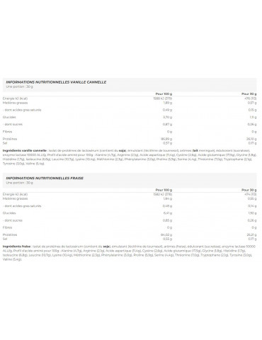 Ingrédients fraise : isolat de protéines de lactosérum (contient du soja), émulsiant (lécithine de tournesol), arômes (fraise), édulcorant (sucralose), enzyme lactase 10000 ALU/g. Profil d'acide aminé pour 100g : Alanine (4,7g), Arginine (2,1g), Acide aspartique (11,4g), Cystine (2,6g), Acide glutamique (17,5g), Glycine (1,8g), Histidine (1,7g), Isoleucine (6,8g), Leucine (10,7g), Lysine (10,4g), Méthionine (2,3g), Phénylalanine (3,0g), Proline (5,9g), Serine (4,4g), Thréonine (7,0g), Tryptophane (2,1g), Tyrosine (3,0g), Valine (5,4g).