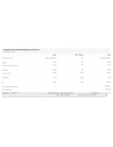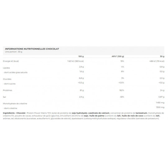 Ingrédients - Chocolat : Protein Power Matrix 72% isolat de protéine de soja hydrolysée, caséinate de calcium, concentrat de protéine de lactosérum, monohydrate de créatine 5%, poudre de cacao, exhausteur de goût (glycine), émulsifiant (lécithine de soja), huile de palme (contient du lait), huile de noix de coco (contient du lait), arômes, sel, édulcorants (sucralose, acésulfame K, glycosides de stéviol), épaississant (carboxyméthylcellulose sodique), régulateur d'acidité (tartrates de potassium).