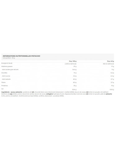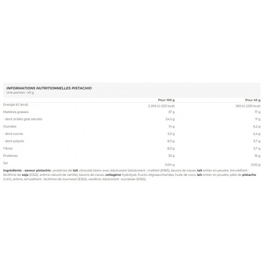 Ingrédients - saveur pistachio : protéines de lait, chocolat blanc avec édulcorant (édulcorant : maltitol (E965), beurre de cacao, lait entier en poudre, émulsifiant : lécithine de soja (E322), arôme naturel de vanille), beurre de cacao, collagène hydrolysé, fructo-oligosaccharides, huile de coco, lait entier en poudre, pâte de pistache (1,4%), arôme, émulsifiant : lécithine de tournesol (E322), vanilline, édulcorant : sucralose (E955).
