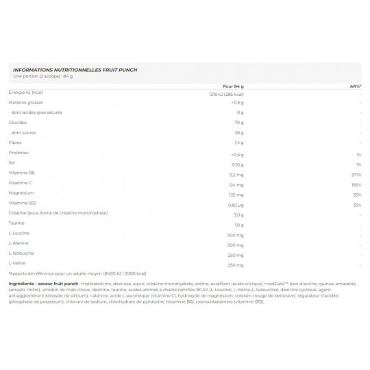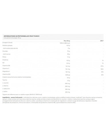 Ingrédients - saveur fruit punch : maltodextrine, dextrose, sucre, créatine monohydrate, arôme, acidifiant (acide citrique), modCarb™ (son d'avoine, quinoa, amarante, sarrasin, millet), amidon de maïs cireux, dextrine, taurine, acides aminés à chaîne ramifiée BCAA (L-Leucine, L-Valine, L-Isoleucine), dextrine cyclique, agent antiagglomérant (dioxyde de silicium), l-alanine, acide L-ascorbique (vitamine C), hydroxyde de magnésium, colorant (rouge de betterave), régulateur d'acidité (phosphate de potassium), chlorure de sodium, chlorhydrate de pyridoxine (vitamine B6), cyanocobalamine (vitamine B12).