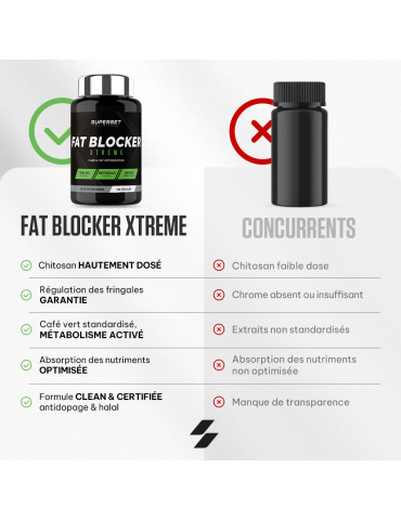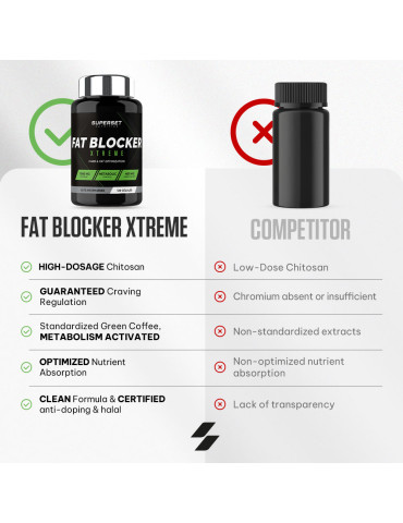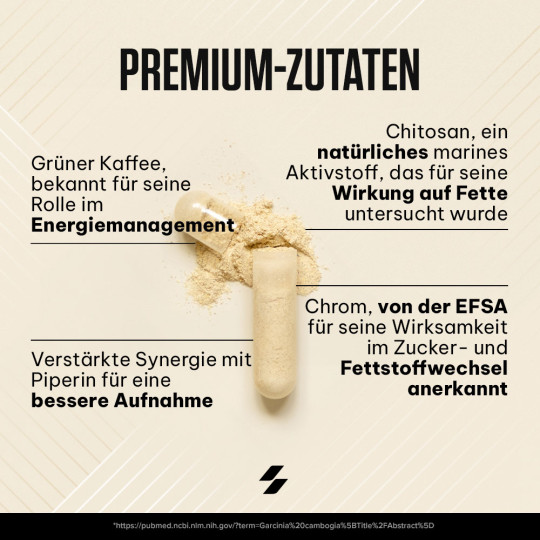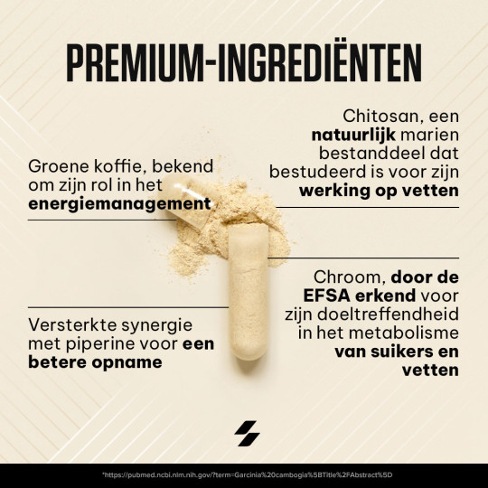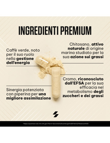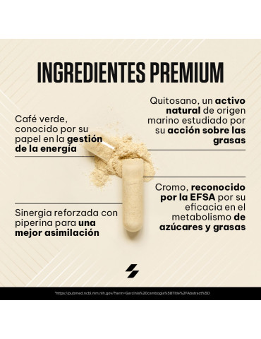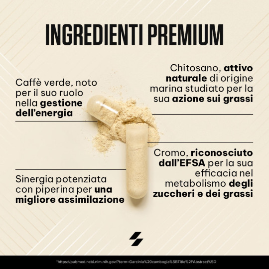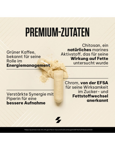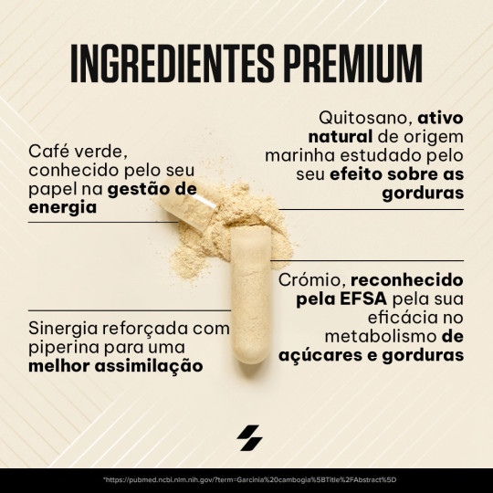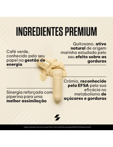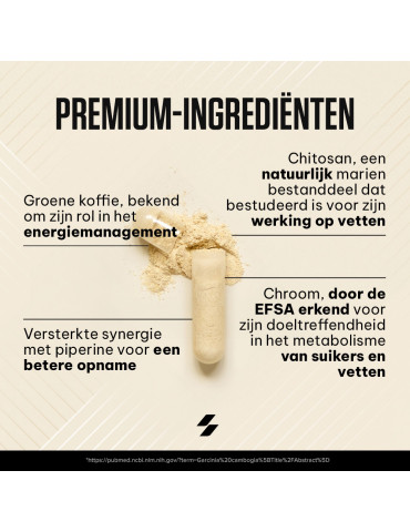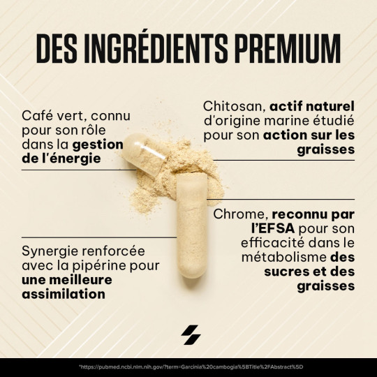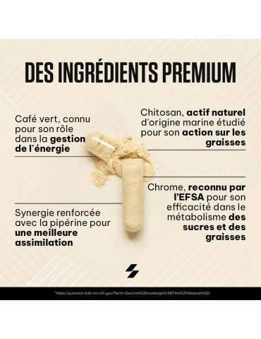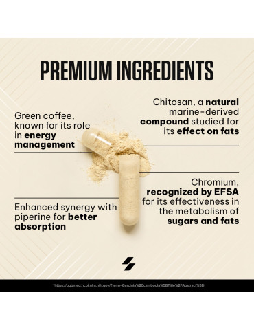 Ingrédients : chitosan (crustacés) 47 %, extrait de grain de café vert (Coffea robusta) 18 %, agents de charge (gel de cellulose, phosphates de calcium), enveloppe de la capsule (gélatine), anti-agglomérants (sels de magnésium d’acides gras, dioxyde de silicium), extrait de fruit de poivre noir (Piper nigrum) 0,068 %, chlorure de chrome (III).