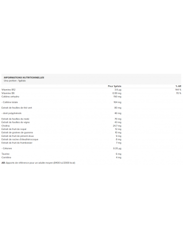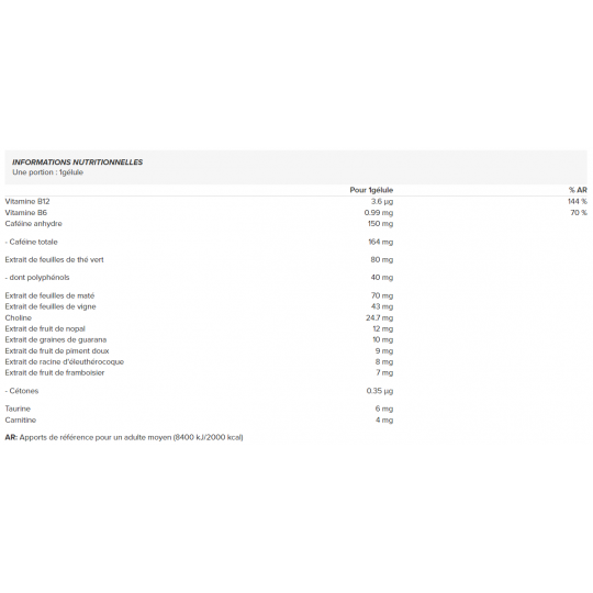 Ingrédients : caféine anhydre, agent d'enrobage (hydroxypropylméthylcellulose), extrait de thé vert (Camellia sinensis, feuilles) standardisé à 50% de polyphenols, extrait de maté (Ilex paraguariensis, feuille), bitartrate de choline, extrait de raisin (Vitis vinifera, feuilles), extrait de nopal (Opuntia ficus indica, fruit), extrait de guarana (Paullinia cupana, graines), extrait de piment doux (Capsicum annuum, fruit), extrait d'éleuthérocoque (Eleutherococcus senticosus, racine), extrait de framboisier (Rubus idaeus, fruit) titré à 0.005% de cétones, taurine, acétyl-L-Carnitine, colorant (oxyde de fer noir), chlorhydrate de pyridoxine (vitamine B6), cyanocobalamine (vitamine B12).