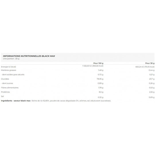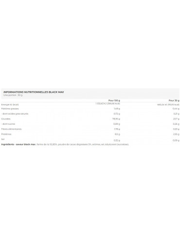 Ingrédients - saveur black max : farine de riz 92,85%, poudre de cacao dégraissée 5%, arômes, sel, édulcorant (sucralose).