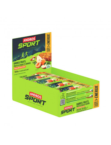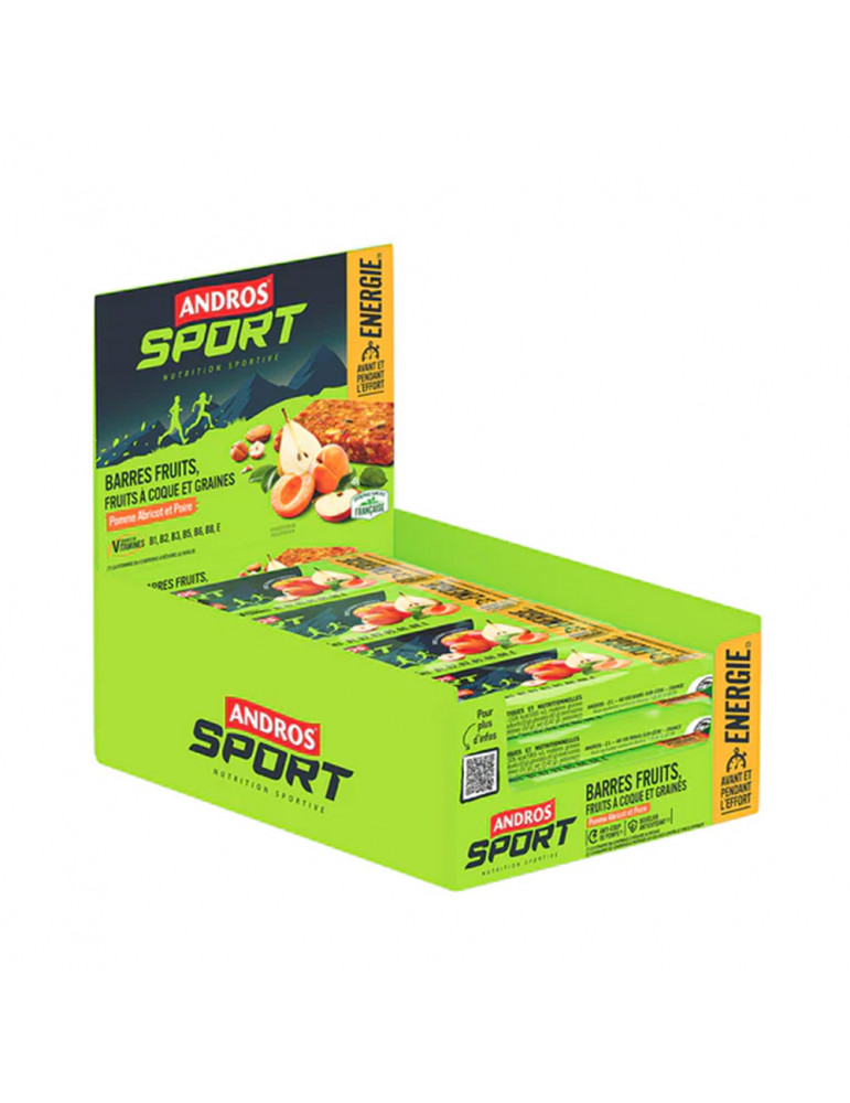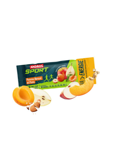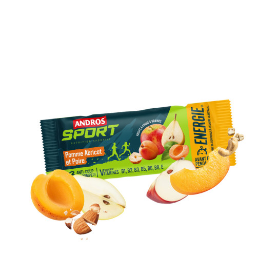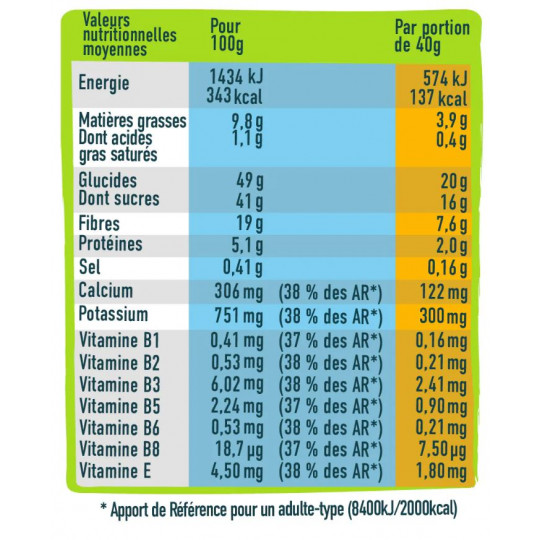 Ingrédients - saveur pomme abricot poire : pommes déshydratées 23% (pommes, conservateur : sulfites), abricots secs 22% (abricots 95%, farine de riz, conservateur: sulfites), poires déshydratées 11% (poires, dextrose monohydrate), raisins secs (raisins, huile de tournesol), mélange de graines 8,0% (tournesol décortiquées, lin brun toasté, courge grillée non salée), fibres d'acacia, amandes décortiquées 5,0%, figues séchées (figues 97%, farine de riz), noisettes décortiquées 3,0%, canneberges séchées sucrées (canneberges 55%, sucre, huile de tournesol), baies de goji séchées, baies de cassis infusées au jus de pomme et séchées (cassis 83%, jus de pomme concentré, jus de citron concentré, huile de tournesol), fibres de citron, sel, phosphates de potassium et de calcium, vitamines (B1,B2,B3,B5,B6,B8,E).