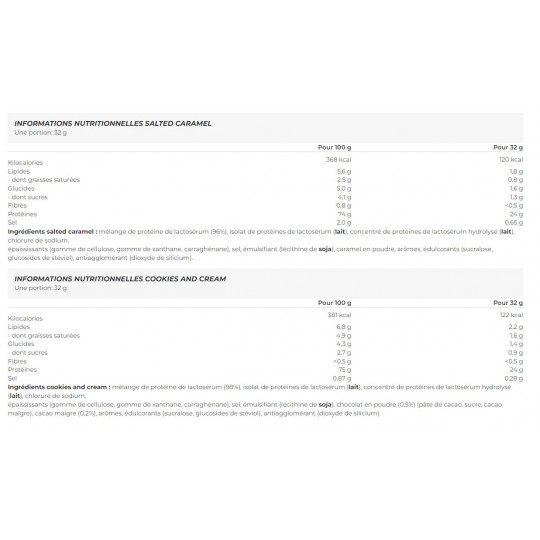 Ingrédients cookies and cream : mélange de protéine de lactosérum (98%), isolat de protéines de lactosérum (lait), concentré de protéines de lactosérum hydrolysé (lait), chlorure de sodium,