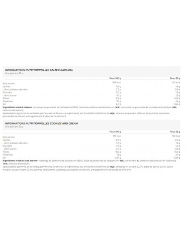 Ingrédients salted caramel : mélange de protéine de lactosérum (96%), isolat de protéines de lactosérum (lait), concentré de protéines de lactosérum hydrolysé (lait), chlorure de sodium,