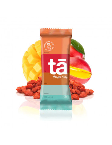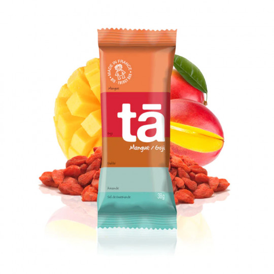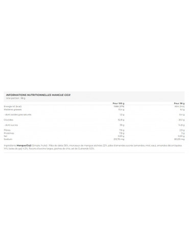 Ingrédients Mangue/Goji (Simple, fruité) : Pâte de datte 36%, morceaux de mangue séchées 22%, pâte d'amandes sucrée (amandes, miel, eau), amandes décortiquées 14%, baies de goji 4,5%, flocons d'avoine larges, graines de chia, sel de Guérande 0,5%.
