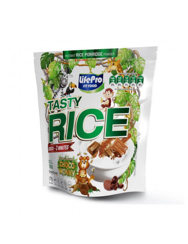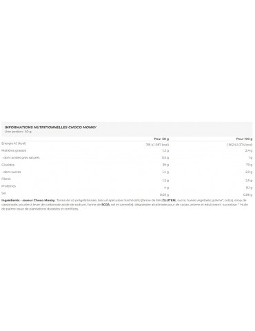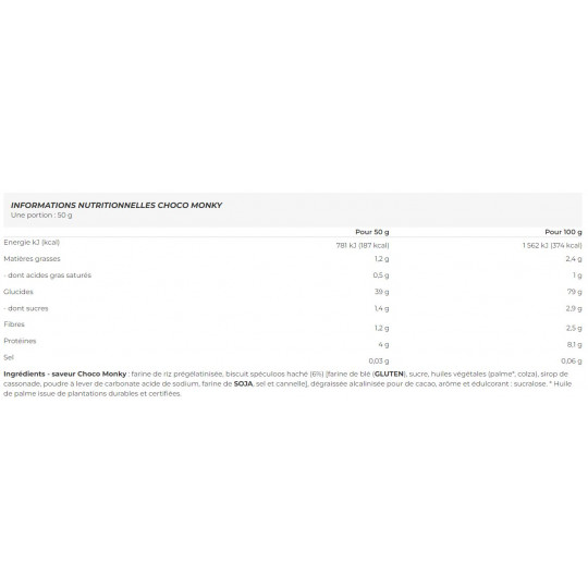 Ingrédients - saveur Choco Monky : farine de riz prégélatinisée, biscuit spéculoos haché (6%) [farine de blé (GLUTEN), sucre, huiles végétales (palme*, colza), sirop de cassonade, poudre à lever de carbonate acide de sodium, farine de SOJA, sel et cannelle], dégraissée alcalinisée pour de cacao, arôme et édulcorant : sucralose. * Huile de palme issue de plantations durables et certifiées.