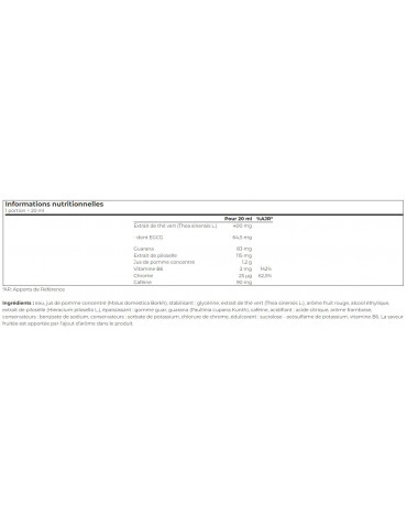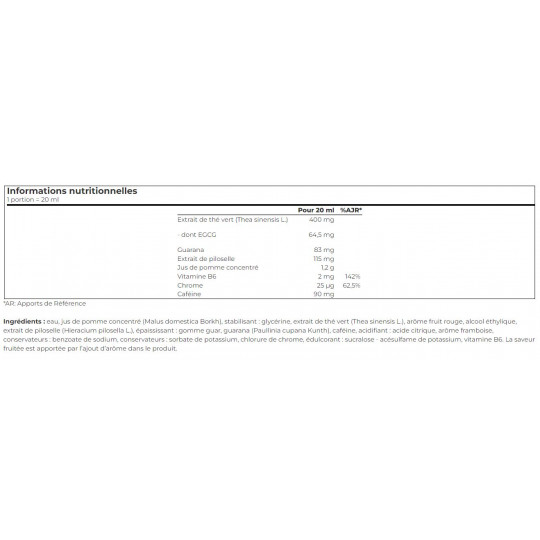 Ingrédients : eau, jus de pomme concentré (Malus domestica Borkh), stabilisant : glycérine, extrait de thé vert (Thea sinensis L.), arôme fruit rouge, alcool éthylique, extrait de piloselle (Hieracium pilosella L.), épaississant : gomme guar, guarana (Paullinia cupana Kunth), caféine, acidifiant : acide citrique, arôme framboise, conservateurs : benzoate de sodium, conservateurs : sorbate de potassium, chlorure de chrome, édulcorant : sucralose - acésulfame de potassium, vitamine B6. La saveur fruitée est apportée par l’ajout d’arôme dans le produit.