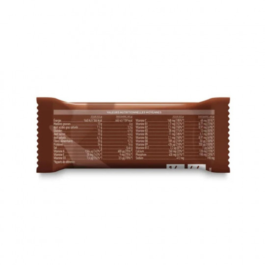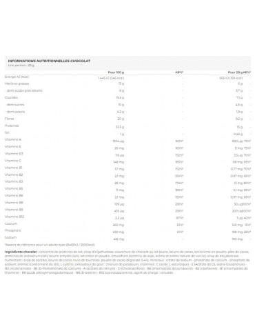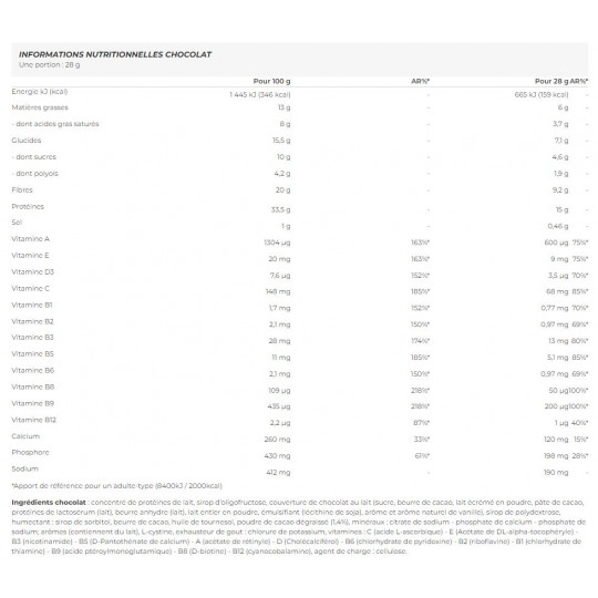 Ingrédients chocolat : concentré de protéines de lait, sirop d’oligofructose, couverture de chocolat au lait (sucre, beurre de cacao, lait écrémé en poudre, pâte de cacao, protéines de lactosérum (lait), beurre anhydre (lait), lait entier en poudre, émulsifiant (lécithine de soja), arôme et arôme naturel de vanille), sirop de polydextrose, humectant : sirop de sorbitol, beurre de cacao, huile de tournesol, poudre de cacao dégraissé (1,4%), minéraux : citrate de sodium - phosphate de calcium - phosphate de sodium; arômes (contiennent du lait), L-cystine, exhausteur de gout : chlorure de potassium, vitamines : C (acide L-ascorbique) - E (Acétate de DL-alpha-tocophéryle) - B3 (nicotinamide) - B5 (D-Pantothénate de calcium) - A (acétate de rétinyle) - D (Cholécalciférol) - B6 (chlorhydrate de pyridoxine) - B2 (riboflavine) - B1 (chlorhydrate de thiamine) - B9 (acide ptéroylmonoglutamique) - B8 (D-biotine) - B12 (cyanocobalamine), agent de charge : cellulose.