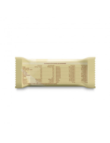 Ingrédients Noix de coco : concentré de protéines de lait, sirop d’oligofructose, couverture de chocolat au lait (sucre, beurre de cacao, lait écrémé en poudre, pâte de cacao, protéines de lactosérum (lait), beurre anhydre (lait), lait entier en poudre, émulsifiant (lécithine de soja), arôme et arôme naturel de vanille), sirop de polydextrose, humectant : sirop de sorbitol, beurre de cacao, noix de coco râpée (2,3%), minéraux : citrate de sodium - phosphate de calcium - phosphate de sodium, huile de tournesol, L-cystine, exhausteur de goût (chlorure de potassium), vitamines : C (acide L-ascorbique) - E (acétate de DL-alpha-tocophéryle) - B3 (nicotinamide) - B5 (D-Pantothénate de calcium) - A (acétate de rétinyle) - D (cholécalciférol) - B6 (chlorhydrate de pyridoxine) - B2 (riboflavine) - B1 (chlorhydrate de thiamine) - B9 (acide ptéroylmonoglutamique) - B8 (D-biotine) - B12 (cyanocobalamine), agent de charge : cellulose, arôme.