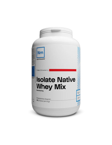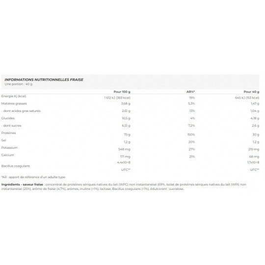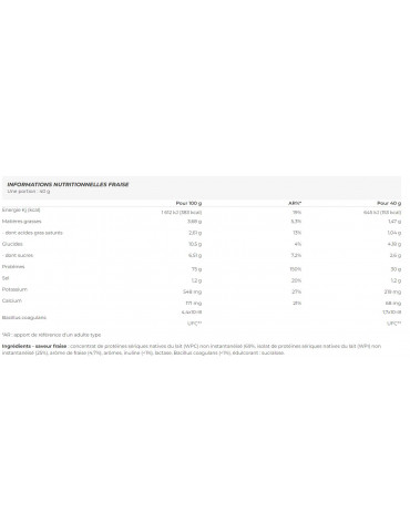 Ingrédients - saveur fraise : concentrat de protéines sériques natives du lait (WPC) non instantanéisé (69%, isolat de protéines sériques natives du lait (WPI) non instantanéisé (25%), arôme de fraise (4,7%), arômes, inuline (<1%), lactase, Bacillus coagulans (<1%), édulcorant : sucralose.