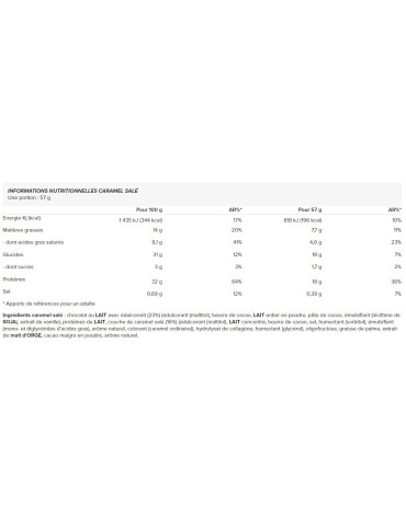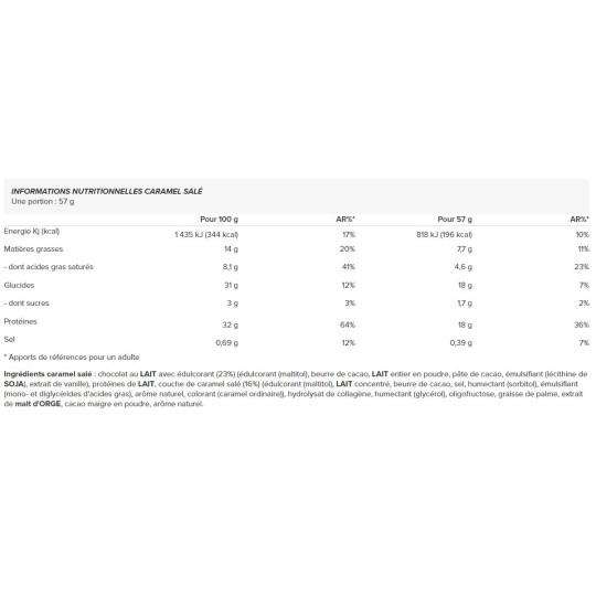Ingrédients caramel salé : chocolat au LAIT avec édulcorant (23%) (édulcorant (maltitol), beurre de cacao, LAIT entier en poudre, pâte de cacao, émulsifiant (lécithine de SOJA), extrait de vanille), protéines de LAIT, couche de caramel salé (16%) (édulcorant (maltitol), LAIT concentré, beurre de cacao, sel, humectant (sorbitol), émulsifiant (mono- et diglycérides d'acides gras), arôme naturel, colorant (caramel ordinaire)), hydrolysat de collagène, humectant (glycérol), oligofructose, graisse de palme, extrait de malt d'ORGE, cacao maigre en poudre, arôme naturel.