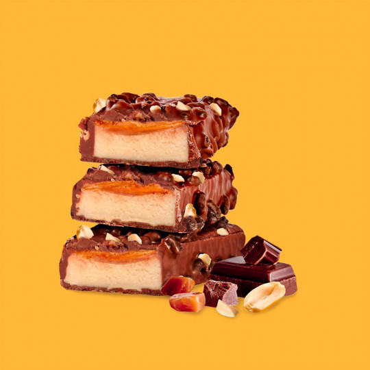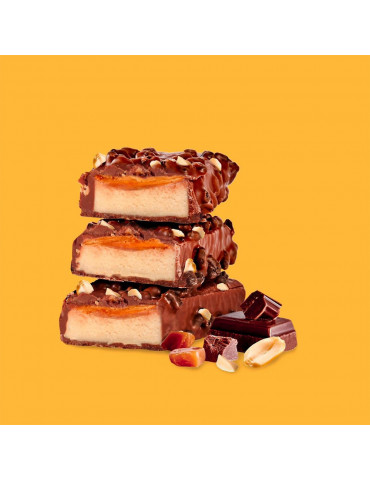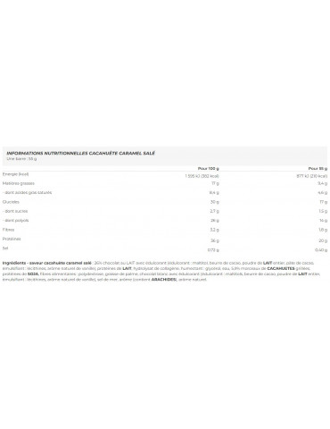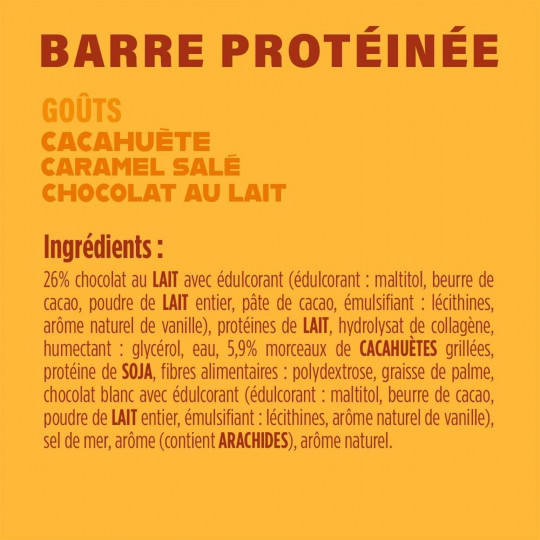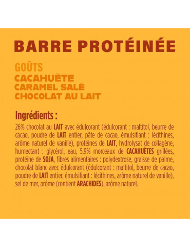 Ingrédients - saveur cacahuète caramel salé : 26% chocolat au LAIT avec édulcorant (édulcorant : maltitol, beurre de cacao, poudre de LAIT entier, pâte de cacao, émulsifiant : lécithines, arôme naturel de vanille), protéines de LAIT, hydrolysat de collagène, humectant : glycérol, eau, 5,9% morceaux de CACAHUETES grillées, protéines de SOJA, fibres alimentaires : polydextrose, graisse de palme, chocolat blanc avec édulcorant (édulcorant : maltitols, beurre de cacao, poudre de LAIT entier, émulsifiant : lécithines, arôme naturel de vanille), sel de mer, arôme (contient ARACHIDES), arôme naturel.
