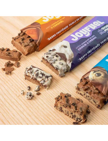 Ingrédients - saveur cookie dough : 25% chocolat au lait avec édulcorant (édulcorant : maltitol, beurre de cacao, poudre de LAIT entier, pâte de cacao, émulsifiant : lécithines, arôme naturel de vanille), protéines de LAIT, humectant (glycérol), hydrolysat de collagène, 8,6% billettes de SOJA et cacao (protéine de SOJA , poudre de cacao, amidon de tapioca), chocolat blanc avec édulcorant (pâte de cacao, édulcorant : maltitol, beurre de cacao, émulsifiant : lécithines, arôme naturel de vanille), graisse de palme, arômes, arôme naturel, eau, sel, arôme naturel de vanille, poudre à lever : carbonate acide de sodium], agent de charge : polydextrose.