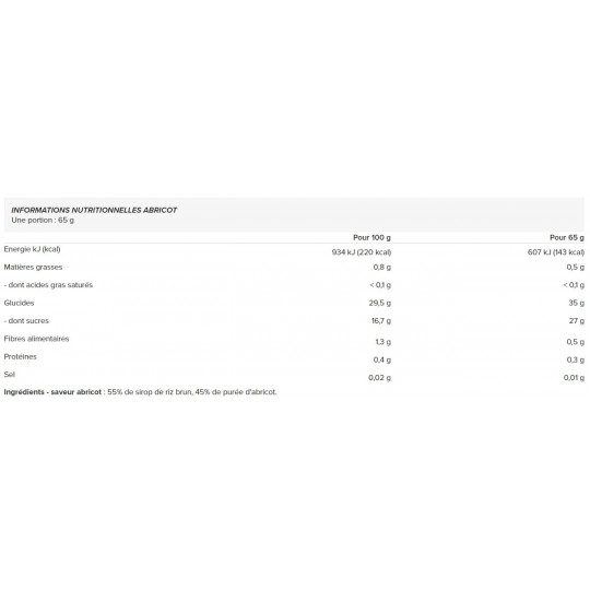 Ingrédients - saveur abricot : 55% de sirop de riz brun, 45% de purée d'abricot.