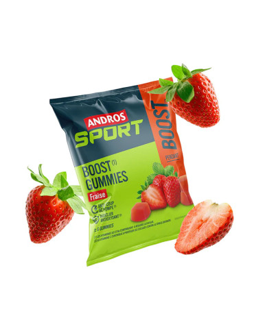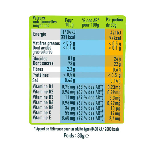 Ingrédients Fraise : purées de fruits 55% (fraises 34%, pommes 21%), sucre, sirop de glucose, gélifiant : pectines, acidifiant : acide citrique, arôme naturel de fraise, vitamines B1, B2, B3, B6, B8, E, C, agent d'enrobage : cire de carnauba, huile de tournesol. Amidon de BLÉ.