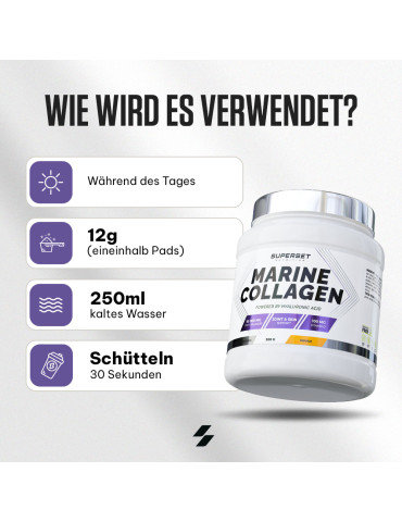 Ingrédients orange : collagène de poisson 83%, acides (acide citrique, acide malique), agent de charge (polydextrose), arômes, hyaluronate de sodium 0,93%, acide L-ascorbique (vitamine C) 0,83%, édulcorant (sucralose), colorant (riboflavines), poudre de concentré de betterave [maltodextrine, concentré de betterave, acide (acide citrique)], sel.