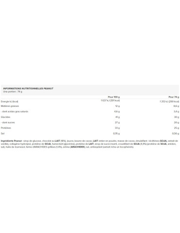 Ingrédients Peanut : sirop de glucose, chocolat au LAIT (18%), (sucre, beurre de cacao, LAIT entier en poudre, masse de cacao, émulsifiant : lécithines (SOJA), extrait de vanille), collagène hydrolysé, protéine de SOJA, humectant (glycérine), protéine de LAIT, sirop de sucre inverti, croustillant de SOJA (4,4%) (protéine de SOJA, amidon, sel), huile de tournesol, farine d'ARACHIDES grillées (1,4%), arôme [ARACHIDES], sel, antioxydant (extrait riche en tocophérols).
