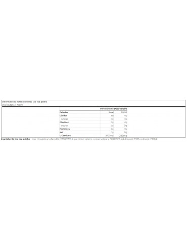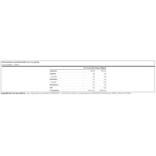 Ingrédients Ice tea pêche : eau, régulateurs d’acidité: E330/E331, L-carnitine, arôme, conservateurs: E202/E211, édulcorant: E955, colorant: E150d.