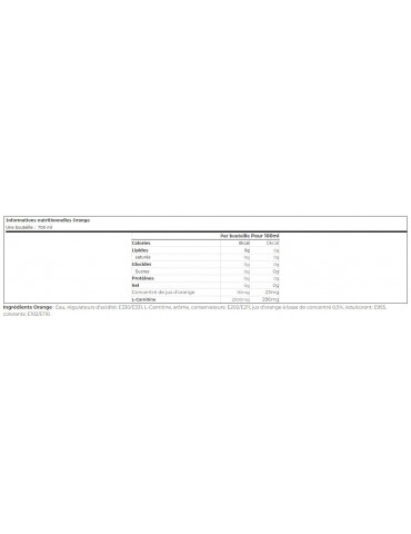 Ingrédients Orange : Eau, régulateurs d’acidité: E330/E331, L-Carnitine, arôme, conservateurs: E202/E211, jus d’orange à base de concentré 0,5%, édulcorant: E955, colorants: E102/E110.
