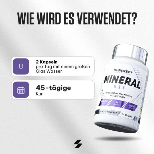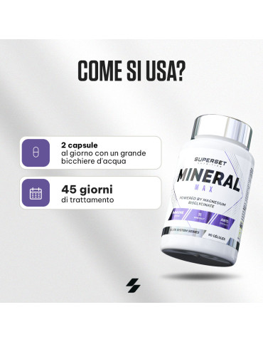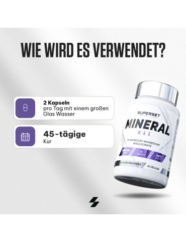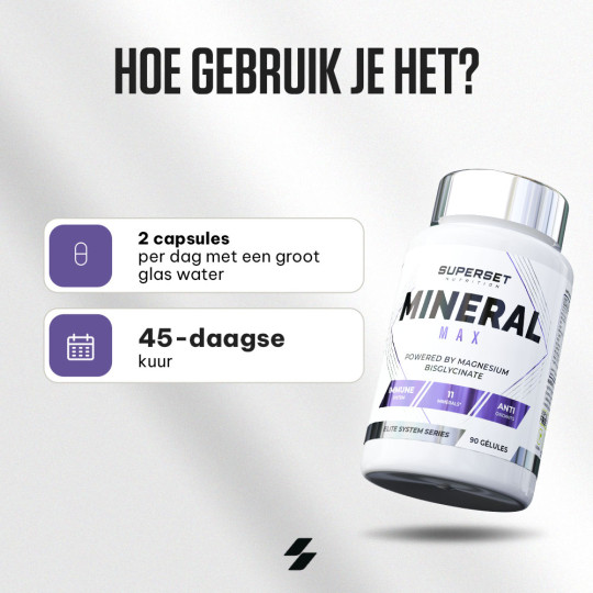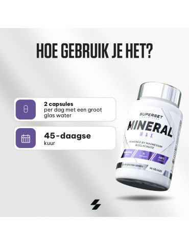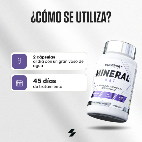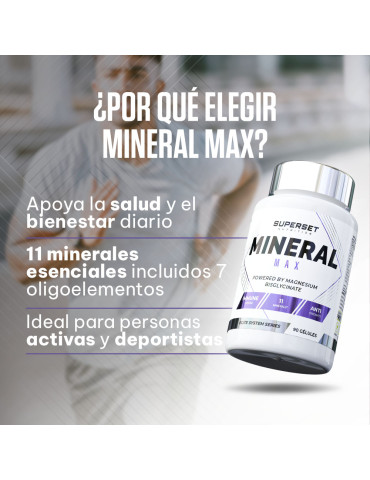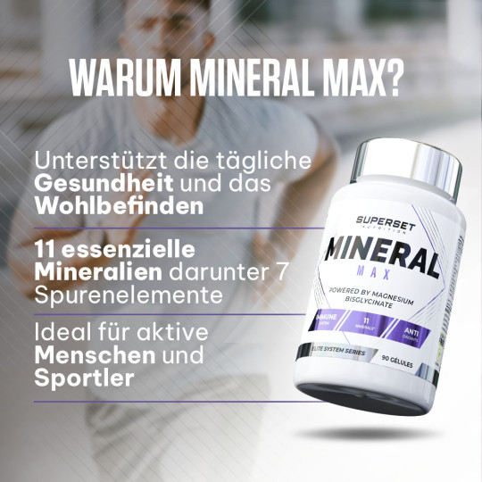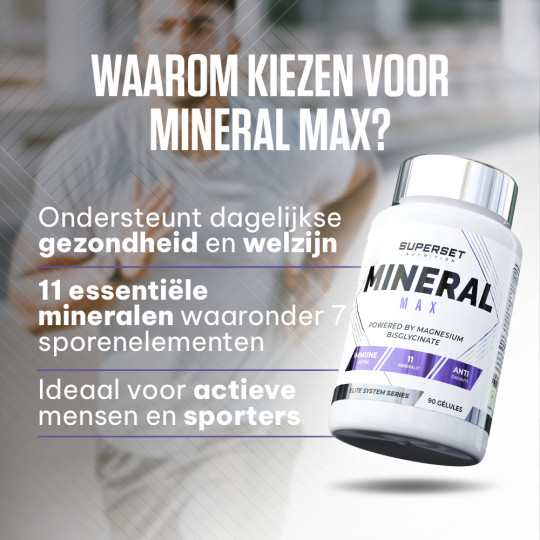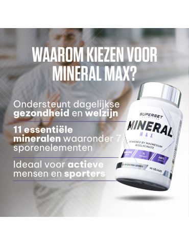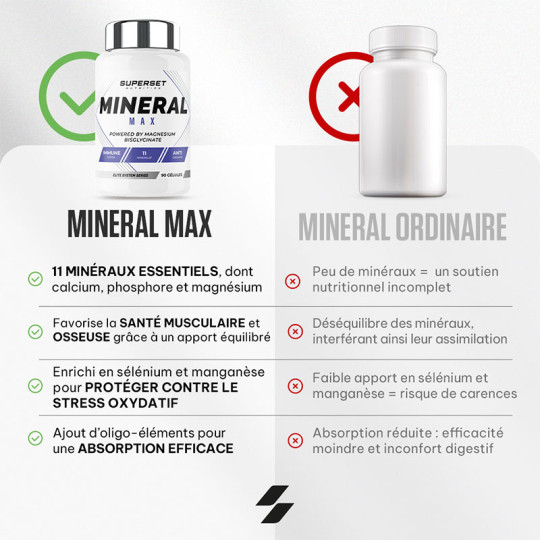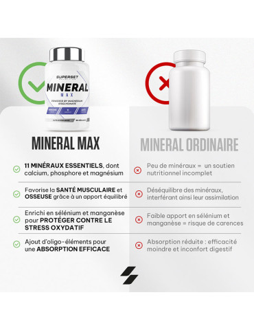 Ingrédients : calcium (carbonate de calcium), phosphore (phosphate de dihydrogène), magnésium (bisglycinate de magnésium), fer (sulfate ferreux), zinc (citrate de zinc), manganèse (gluconate de manganèse), cuivre (gluconate de cuivre), iode (iodure de potassium), sélénium (L-sélénométhionine), chrome (picolinate de chrome), molybdène (molybdate de sodium), agent de remplissage (cellulose microcristalline).