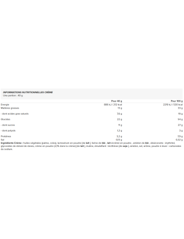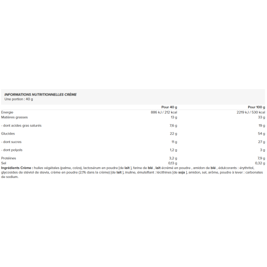 Ingrédients Crème : huiles végétales (palme, colza), lactosérum en poudre [de lait], farine de blé, lait écrémé en poudre, amidon de blé, édulcorants : érythritol, glycosides de stéviol de stevia, crème en poudre (2,1% dans la crème) [de lait], inuline, émulsifiant : lécithines [de soja], amidon, sel, arôme, poudre à lever : carbonates de sodium.