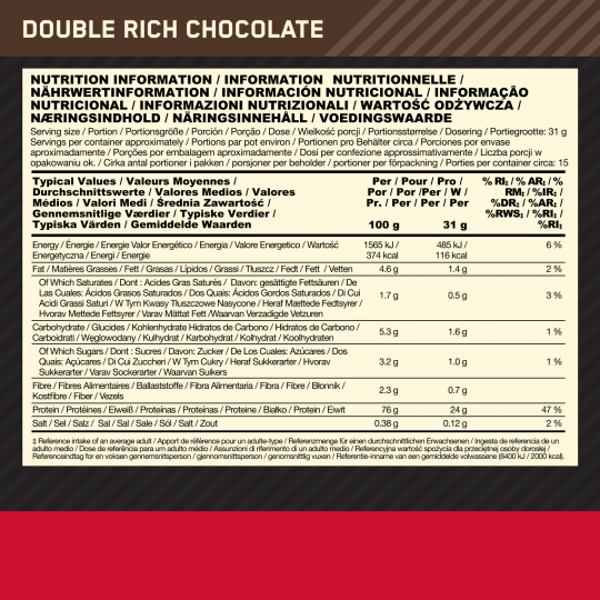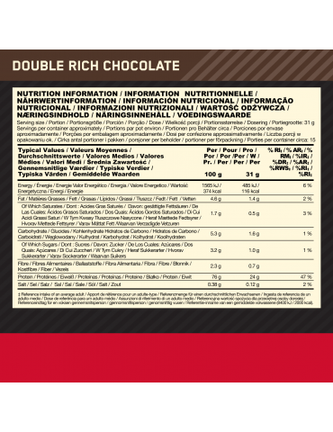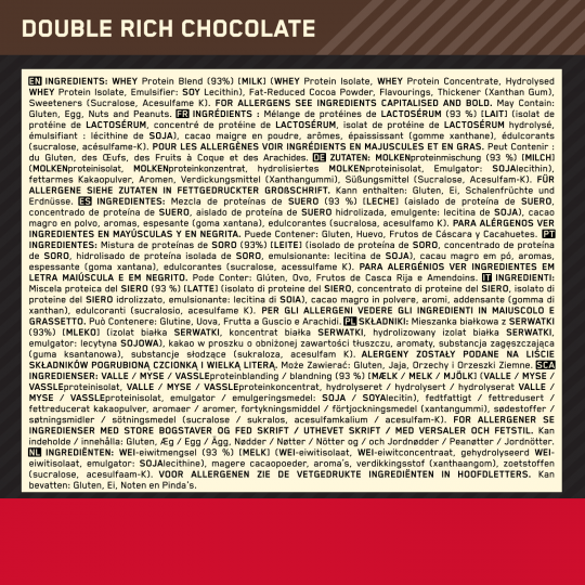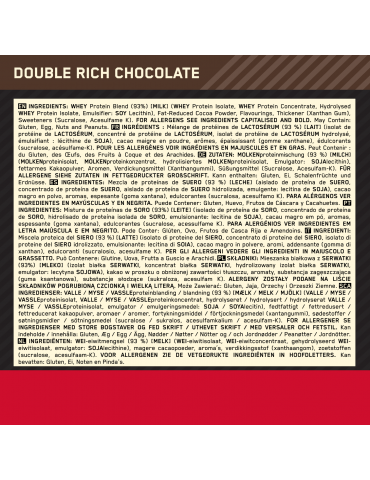 Ingrédients Chocolat : Mélange de Protéines (Isolat de Protéine de Lactosérum (Émulsifiant (Lécithine de Soja)), Concentré de protéine de lactosérum, Isolat de Protéine de Lactosérum Hydrolysé), cacao maigre en poudre, Arômes, Édulcorants (Acésulfame-K, Sucralose), Complexe Enzymatique (Amylase, Protéase, Cellulase, Beta-D-Galactosidase, Lipase).