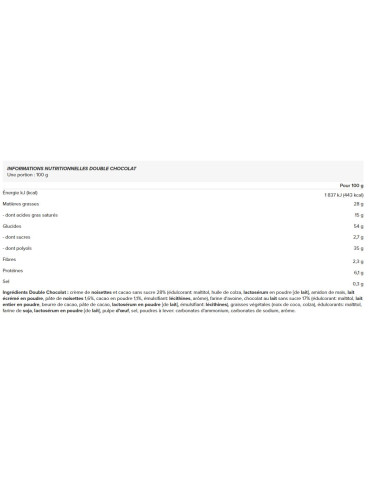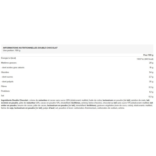 Ingrédients Double Chocolat : crème de noisettes et cacao sans sucre 28% (édulcorant: maltitol, huile de colza, lactosérum en poudre [de lait], amidon de maïs, lait écrémé en poudre, pâte de noisettes 1,6%, cacao en poudre 1,1%, émulsifiant: lécithines, arôme), farine d'avoine, chocolat au lait sans sucre 17% (édulcorant: maltitol, lait entier en poudre, beurre de cacao, pâte de cacao, lactosérum en poudre [de lait], émulsifiant: lécithines), graisses végétales (noix de coco, colza), édulcorants: maltitol, farine de soja, lactosérum en poudre [de lait], pulpe d'œuf, sel, poudres à lever: carbonates d'ammonium, carbonates de sodium, arôme.