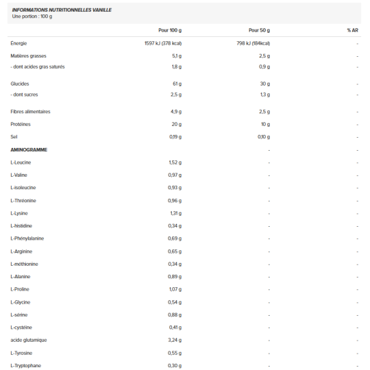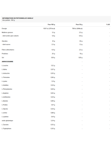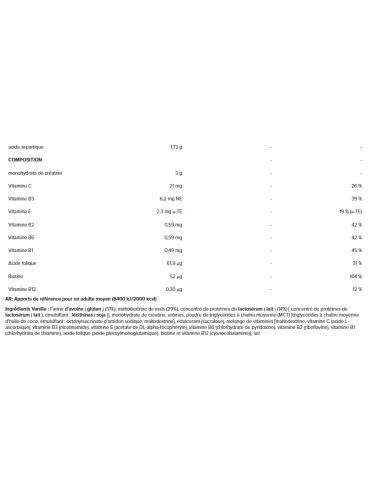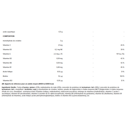 Ingrédients Vanille : farine d'avoine ( gluten ) (51%), maltodextrine de maïs (29%), concentré de protéines de lactosérum ( lait ) (14%) [concentré de protéines de lactosérum (lait), émulsifiant : lécithines (soja)], monohydrate de créatine, arômes, poudre de triglycérides à chaîne moyenne (MCT) [triglycérides à chaîne moyenne d'huile de coco, émulsifiant : octénylsuccinate d'amidon sodique, maltodextrine], édulcorant (sucralose), mélange de vitamines [maltodextrine, vitamine C (acide L-ascorbique), vitamine B3 (nicotinamide), vitamine E (acétate de DL-alpha-tocophéryle), vitamine B6 (chlorhydrate de pyridoxine), vitamine B2 (riboflavine), vitamine B1 (chlorhydrate de thiamine), acide folique (acide ptéroylmonoglutamique), biotine et vitamine B12 (cyanocobalamine)], sel.