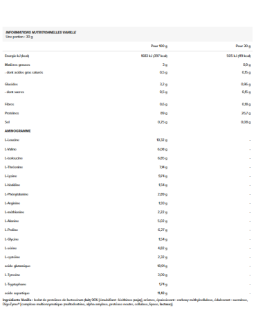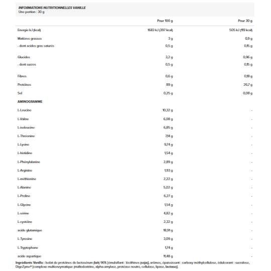 Ingrédients Vanille : isolat de protéines de lactosérum (lait) 96% [émulsifiant : lécithines (soja)], arômes, épaississant : carboxy méthylcellulose, édulcorant : sucralose, DigeZyme® [complexe multienzymatique (maltodextrine, alpha-amylase, protéase neutre, cellulase, lipase, lactase)].