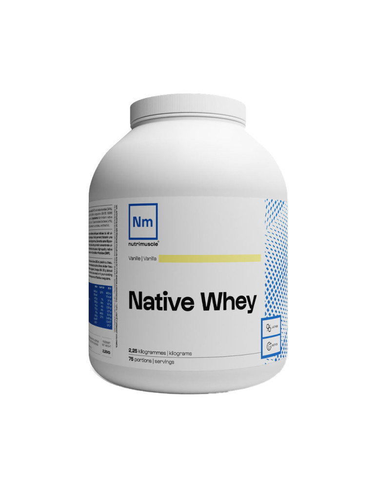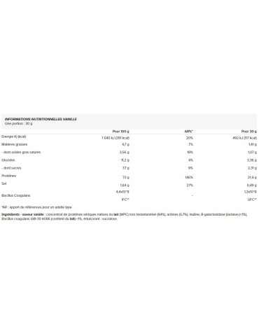 Ingrédients - saveur vanille : concentrat de protéines sériques natives du lait (WPC) non instantanéisé (94%), arômes (5,7%), inuline, B-galactosidase (lactase) (<1%), Bacillus coagulans GBI-30 6086 (contient du lait) <1%, édulcorant : sucralose.