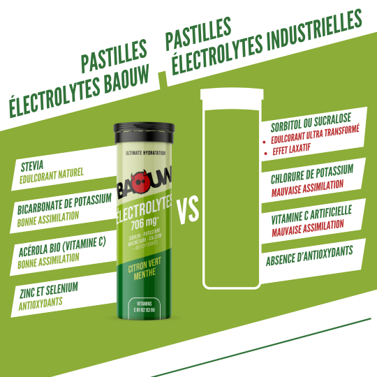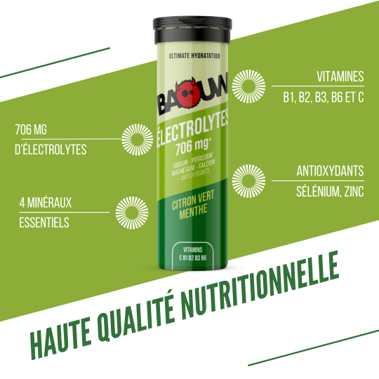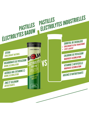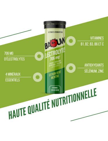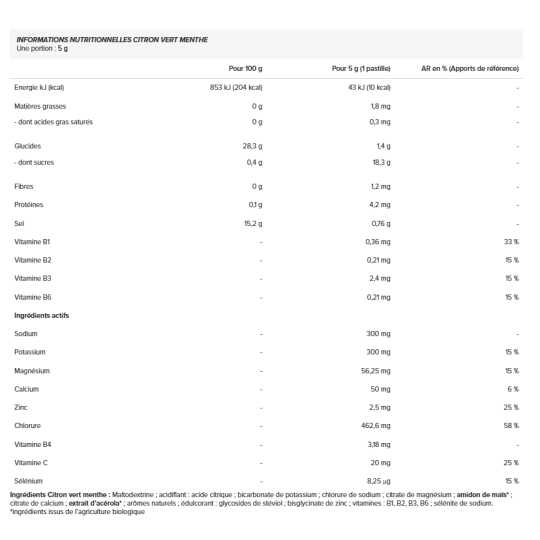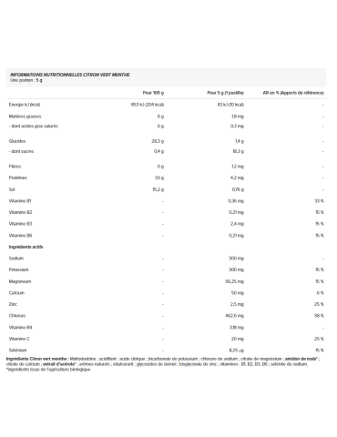 Ingrédients - Citron vert menthe : maltodextrine ; acidifiant : acide citrique ; bicarbonate de potassium ; chlorure de sodium ; citrate de magnésium ; amidon de maïs* ; citrate de calcium ; extrait d’acérola* ; arômes naturels ; édulcorant : glycosides de stéviol ; bisglycinate de zinc ; vitamines : B1, B2, B3, B6 ; sélénite de sodium. *ingrédients issus de l’agriculture biologique