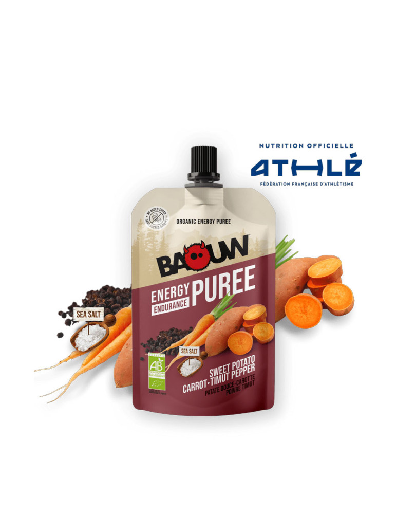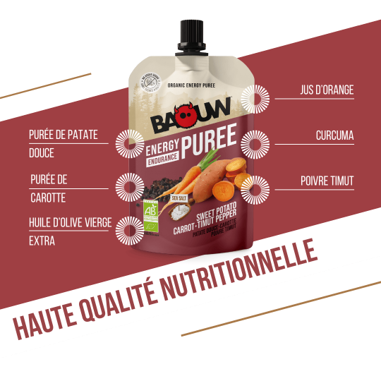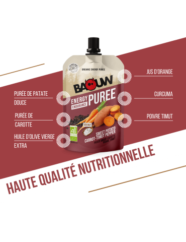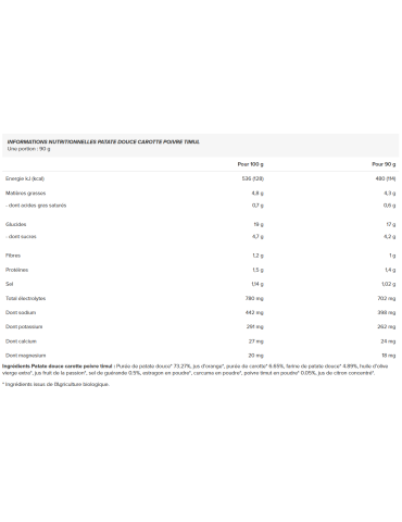 Ingrédients Patate douce carotte poivre timul : Purée de patate douce* 73.27%, jus d'orange*, purée de carotte* 6.65%, farine de patate douce* 4.89%, huile d’olive vierge extra*, jus fruit de la passion*, sel de guérande 0.5%, estragon en poudre*, curcuma en poudre*, poivre timut en poudre* 0.05%, jus de citron concentré*.