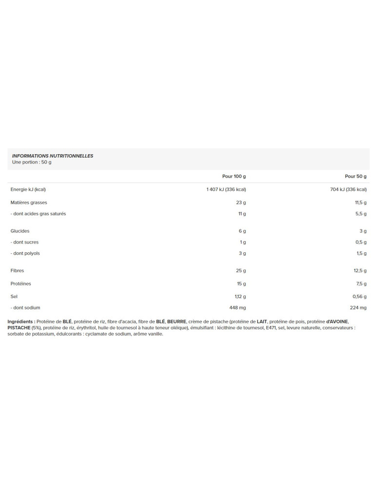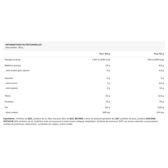 Ingrédients : Protéine de BLÉ, protéine de riz, fibre d'acacia, fibre de BLÉ, BEURRE, crème de pistache (protéine de LAIT, protéine de pois, protéine d'AVOINE, PISTACHE (5%), protéine de riz, érythritol, huile de tournesol à haute teneur oléique), émulsifiant : lécithine de tournesol, E471, sel, levure naturelle, conservateurs : sorbate de potassium, édulcorants : cyclamate de sodium, arôme vanille.