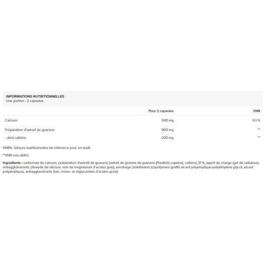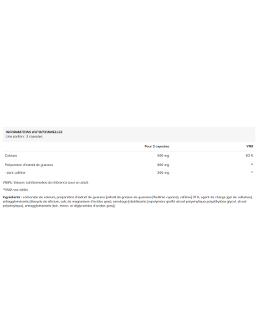 Ingrédients : carbonate de calcium, préparation d’extrait de guarana [extrait de graines de guarana (Paullinia cupana), caféine] 31 %, agent de charge (gel de cellulose), antiagglomérants (dioxyde de silicium, sels de magnésium d’acides gras), enrobage [stabilisants (copolymère greffé alcool polyvinylique-polyéthylène glycol, alcool polyvinylique), antiagglomérants (talc, mono- et diglycérides d’acides gras)].