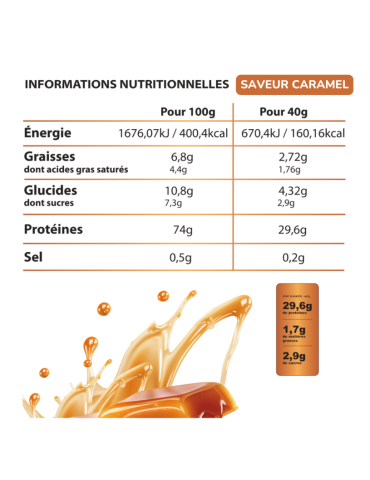 Ingrédients - Caramel Salé : concentré de protéines de lactosérum (LAIT), arôme, émulsifiant : carboxyméthylcellulose, épaississant ; gomme de guar, sel, colorant alimentaire, caramel, édulcorants : sucralose, acésulfame K.