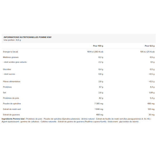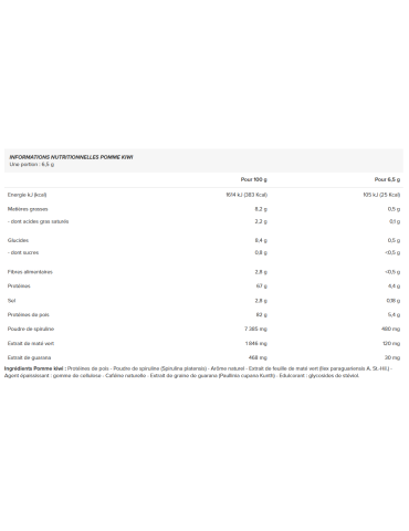 Ingrédients Pomme kiwi : Protéines de pois - Poudre de spiruline (Spirulina platensis) - Arôme naturel - Extrait de feuille de maté vert (Ilex paraguariensis A. St.-Hil.) - Agent épaississant : gomme de cellulose - Caféine naturelle - Extrait de graine de guarana (Paullinia cupana Kunth) - Edulcorant : glycosides de stéviol.