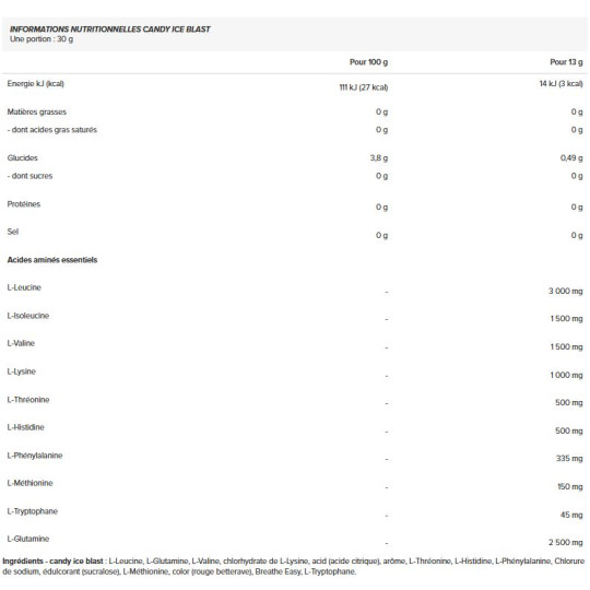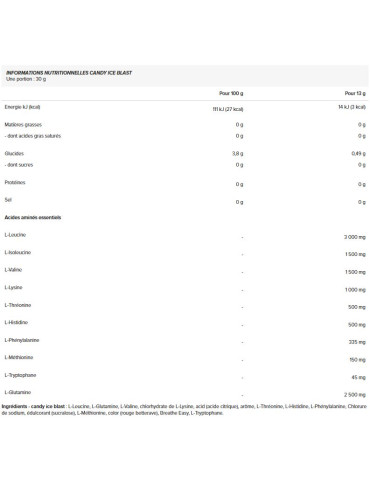 Ingrédients - candy ice blast : L-Leucine, L-Glutamine, L-Valine, chlorhydrate de L-Lysine, acid (acide citrique), arôme, L-Thréonine, L-Histidine, L-Phénylalanine, Chlorure de sodium, édulcorant (sucralose), L-Méthionine, color (rouge betterave), Breathe Easy, L-Tryptophane.