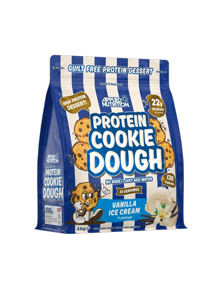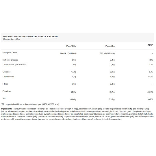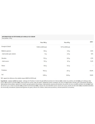 Ingrédients - saveur vanille ice cream : mélange de Protéines Cookie Dough (64%) (Caséinate de Calcium (lait), isolate de protéines de lait (lait)), pré-mélange whip (sucre, lait écrémé en poudre (lait), sirop de glucose séché, huile de palme, stabilisants (esters acétiques de mono et diglycérides d'acides gras, phosphate disodique, diphosphate tétrasodique, alginate de sodium, pyrophosphate tétrasodique, triphosphate), épaississant (amidon de pomme de terre modifié), protéine de lait (lait), huile de noix de coco, crème en poudre (lait), poudre de lactosérum (lait)), copeaux de chocolat blanc (sucre, beurre de cacao, poudre de lait entier (lait), émulsifiant (lécithine de tournesol)), aromatisant, épaississant (gomme de guar), chlorure de sodium, édulcorant (sucralose), colorant (extrait de curcumine).