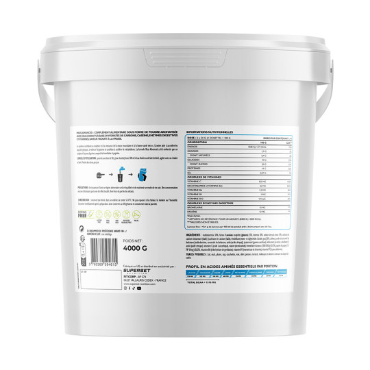 Ingrédients Vanille : maltodextrine 34%, farine d’avoine complète (gluten) 24%, dextrose 20%, amidon de maïs cireux 10%, caséinate de calcium instantanée (lait) [caséinate de calcium (lait), émulsifiant (mono- et diglycérides d’acides gras)] 8%, arômes, poudre de yaourt (lait), épaississant (gomme xanthane), édulcorants (sucralose, acésulfame K), vitamine C (acide L-ascorbique), niacine (nicotinamide), bromélaïne d’ananas (1200 GDU/g) 0,02%, papaïne de papaye (1,5 FIP U/mg) 0,02%, vitamine B6 (chlorhydrate de pyridoxine), vitamine B1 (mononitrate de thiamine), vitamine B12 (cyanocobalamine).