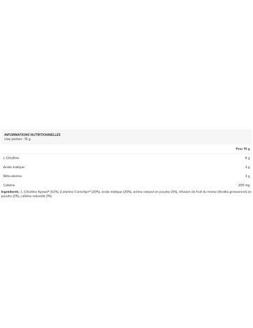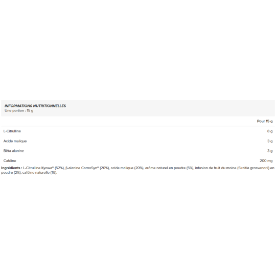Ingrédients : L-Citrulline Kyowa® (52%), β-alanine CarnoSyn® (20%), acide malique (20%), arôme naturel en poudre (5%), infusion de fruit du moine (Siraitia grosvenorii) en poudre (2%), caféine naturelle (1%).