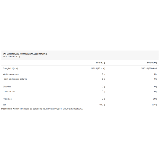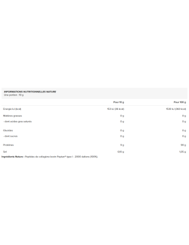 Ingrédients - saveur nature : peptides de collagène bovin Peptan® type I - 2000 daltons (100%).